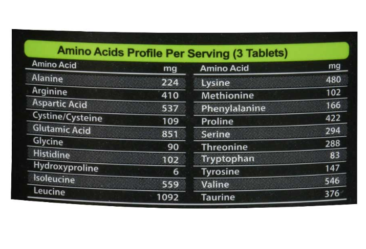 - حاوی پروتئین غلیظ شده آب پنیر، ال-لوسین، ال-ایزولوسین، ال-والین، ال-آرژنین هیدروکلراید، ال-تورین، کربنات کلسیم، استئارات منیزیم، گلیسرین، پلی وینیل پیرولیدن و سیلیکون دی اکساید
