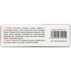 - موارد منع مصرف: توصیه می گردد قبل از مصرف فرآورده در موارد زیر با پزشک یا داروساز خود مشورت نمایید: وجود هر نوع سابقه حساسیت به ترکیبات این فرآورده و سایر مواد مانند ژلاتین، محافظت کننده ها، رنگ های خوراکی و فرآورده های دریایی بیماران هموفیلی مصرف هم زمان با داروهایی از قبیل وارفارین مصرف در دوران بارداری و شیردهی: مصرف در دوران بارداری و شیردهی طبق تجویز پزشک صورت گیرد. تداخلات دارویی: داروها: مصرف هم زمان کلستیرآمین، کلستیپول، اورلیستات، روغن معدنیاز قبیل پارافین، می تواند جذب لوتئین و زیزانتین را کاهش دهد. مکمل های غذایی: مصرف هم زمان بتاکاروتن، تری گلیسیریدها با زنجیره متوسط و پکتین می تواند جذب لوتئین و زیزانتین را کاهش دهد. غذاها: روغن ها: برخی روغن های رژیم غذایی مانند روغن ذرت می تواند جذب لوتئین، زیزانتین بخصوص فرم استری این کاروتنوئیدها را کاهش دهد. اولسترا: مصرف همزمان اولسترا (نوعی ماده جایگزین چربی فاقد هر گونه کالری، کلسترول و چربی) با لوتئین و زیزانتین می تواند جذب این کاروتنوئیدها را کاهش دهد. به علت احتمال کاهش ویتامین k احتمال افزایش اثر داروهای ضد انعقاد مثل وارفارین وجود دارد که ممکن است سبب خونریزی گردد. عوارض جانبی: از مهم ترین عوارض جانبی این فرآورده می توان به اختلالات گوارشی خفیف مانند تهوع، اسهال و آروغ زدن اشاره نمود که به دلیل وجود روغن امگا 3 می باشد که با مصرف فرآورده همراه غذا این مشکل برطرف می شود.