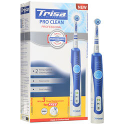 مسواک برقی تریزا پرو کلین پروفشنال Trisa Pro Clean Professional دارای صفحه نمایش هوشمند بوده و 2 حالت تمیز کردن نرمال و حساس را داراست. سری مسواک انعطاف پذیر و دارای برس منعطف است. این محصول دارای هشدار مدت زمان شست و شوی دندانها میباشد.