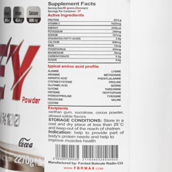 ترکیبات: کنسانتره پروتئین وی، اسید آسکوربیک، گزانتان گام، سوکرالوز، پودر کاکائو، طعم دهنده مجاز خوراکی