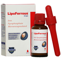 کم خونی یک مشکل جهانی است که حدود یک سوم جمعیت انسانها را تحت تاثیر قرار میدهد. نیمی از موارد کم خونی مربوط به فقر آهن است و کودکان به ویژه از بدو تولد تا 5 سالگی در معرض خطر بالایی برای ابتلا به این نوع کم خونی قرار دارند. مکمل آهن اولین قدم برای پیشگیری و درمان کم خونی می باشد. بر اساس دستورالعمل وزارت بهداشت ایران مصرف مکمل آهن برای تمامی شیرخواران از پایان شش ماهگی ضروری است. قطره لیپوفروس حاوی آهن لیپوزومال پیروفسفات است که به خون سازی و پیشگیری از کم خونی در کودکان کمک می کند آهن لیپوزومال باعث افزایش جذب و کاهش عوارض ناشی از مصرف مکمل آهن (یبوست و دل درد و بوی فلزی آهن سیاه شدن دندانها و غیره) میشود. آهن لیپوزومال: انکپسولاسیون آهن در فرم میکرونیزه در لیپوزومها رویکرد جدیدی برای بهبود جذب و تحمل گوارشی آهن است. آهن پیروفسفات توسط غشای دولایه لیپیدی احاده شده که این پوشش به آهن اجازه میدهد بدون تخریب یا غیرفعال شدن از محیط اسیدی معده عبور کرده و در روده جذب شود. به این ترتیب در برابر تخریب به وسیله آنزیم های گوارشی، فلور روده و رادیکال های آزاد محافظت می شود. دو لایه لیپیدی پایداری مولکول را افزایش می دهد و باعث می شود که محتویات آن به آرامی آزاد گردد. آزاد شدن تدریجی جذب بهتر آهن کمک میکند. همچنین آهن لیپوزومال انحلالپذیری بالاتر و در نتیجه دسترسی بهتری دارد و همین عامل نیز جذب آهن را افزایش میدهد. با میکرونیزاسیون اندازه ذرات کاهش مییابد و حلالیت زیست فراهمی و جذب آهن بیشتر میشود. هرچه جذب آهن بالاتر باشد آسیب اکسیداتیو نیز کمتر میشود یکی از عوارض آزار دهنده مصرف قطره های آهن سیاه شدن دندان های کودک است از آنجایی که قطره لیپوفروس حاوی آهن لیپوزومال باعث سیاه شدن دندان ها نمی شود. همچنین دو لایه لیپیدی آهن پیروفسفات با جلوگیری از تماس مستقیم آهن با پوشش روده ای از عوارض گوارشی آن میکاهد. این قطره فاقد طعم فلزی آهن بوده و بهتر تحمل می شود.