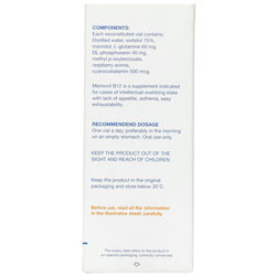 مکانیسم اثر : سه ماده موجود در این فرآورده به دلیل تاثیر مطلوب بر روی متابولیسم بافت اعصاب و رشد و هدایت عصبی شناخته شده میباشند. گلوتامین با عبور از سد خونی مغزی و تبدیل به گلوتامیک اسید باعث حذف ماده سمی آمونیاک از مغز شده و به همراه گلوکز باعث فراهم شدن سوخت برای سلول های مغزی می شود. فسفوسرین در پروسه های بیوشیمیایی مغز مداخله کرده و برای ساخت فسفو پروتئین های مغزی ضروری است، ب 12 نیز دارای نقش تغذیه کننده و محافظ در سیستم اعصاب مرکزی می باشد. ویتامین B12 یا Cobalamin یکی از انواع ضروری ویتامین های محلول در آب می باشد و در طیف مختلفی از خوراکی ها از جمله ماهی، گوشت، تخم مرغ و محصولات لبنی یافت می شود. ویتامین ب12 معمولا به همراه سایر ویتامین های گروه B در محلول ها و مکمل های ویتامین B12 استفاده می شود. ویتامین B12 برای یکسال در کبد افراد ذخیره شده و خطر ابتلای افراد به کم خونی را کاهش می دهد. ویتامین B12 نقشی مهم در تولید DNA ایفا کرده و همچنین در سالم نگه داشتن اعصاب و گلبول های قرمز موثر است. عوارض کمبود ویتامین B12 کودکانی که مادرشان کمبود ویتامین B12 دارد و از شیر وی استفاده می کنند ، درخطر ابتلا به مشکلاتی از جمله افت رشد و کم خونی شود. بعضی از تحقیقات هم نشان می دهند که کمبود ویتامین B12 در مادران باردار می تواند تاثراتی برروی عملکرد روانی نوزادان داشته باشد. کم خونی : کمبود ویتامین ب12 قابلیت بدن درتولید گلبول های قرمز و هموگلوبین را کاهش و سبب بروز کم خونی می گردد ، در آزمایش خون سی بی سی ( CBC ) سطح پایین هموگلوبین ( HB ) و گلبول های قرمز خون (RBC) می توانند نشانه ای از کمبود ویتامین B12 باشند، همچنین کمبود ویتامین ب 12 و فولیک اسید باعث افزایش غیر طبیعی اندازه گلبول های قرمز خون می شوند که با MCV در آزمایش ها نشان داده می شود. کاهش راندمان ذهن و حافظه : کمبود ویتامین B12 با عوارضی که مرتبط با کاهش راندامان مغز است از قبیل کاهش حافظه ، فراموشی ، افسردگی ، گیجی و سردرگمی همراه است. آسیب به سیستم اعصاب مرکزی و رشته های عصبی ( میلین ) : همان طور که اشاره شد ویتامین B12 برای حفظ سلامت پوشش رشته های عصبی ضروری است و در صورت کمبود این ویتامین پوشش رشته های عصبی دچار آسیب شده و علائمی مانند بیماری ام اس بروز می کنند. کاهش انرژی بدن ، خستگی مفرط ، بی حسی و احساس سوزش در دست ها و پاها ، مشکلات عصبی ، ضعف عضلات ، سرگیجه از دیگر علائم کمبود ویتامین B12 می باشند.روش مصرف: