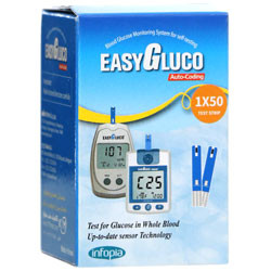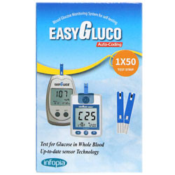 نوار تست قند خون «ایزیگلوکو EasyGluco» برای استفاده در دستگاه تست قند خون ایزی گلوکو Easy Gluco می باشد. برای انجام تست قند میزان 1.5 میکرولیتر خون را بر روی نوار تست Easygluco قرار دهید تا پس از 9 ثانیه نتیجه تست قند را بر روی صفحه نمایش دستگاه مشاهده نمایید.در هر بسته از این محصول، دو قوطی نوار 25 تایی قرار دارد. توجه داشته باشید نوارهای تست قند خون به رطوبت، نور و هوا حساس هستند و پس از برداشتن نوار برای انجام تست قند خون در ظرف را سریع ببندید. همچنین نوارهای تست قند خون موجود درون ظرف نیز پس از باز شدن در ظرف، باید حداکثر در مدت 3 ماه از آنها استفاده نمایید.