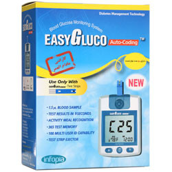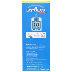 دستگاه تست قند خون ایزی گلوکو Easy Gluco، این دستگاه تست قند ساخته شده توسط شرکت Infopia کره جنوبی می باشد که به علت داشتن دقت بالا و قابلیتهای بسیار آن، به بیش از 30 کشور جهان صادر شده است. تست قند خون EasyGluco برای سنجش قند خون تنها به 1.5 میکرولیتر خون نیاز دارد و در زمان 9 ثانیه مقدار قند خون را نشان می دهد که می توانید با تنظیم شناسه اختصاصی، آزمایش قند خون خود را انجام دهید. در تست قند خون ایزی گلوکو اتوکدینگ شناسایی نوار تست به صورت تمام اتوماتیک توسط خود دستگاه انجام می شود.
