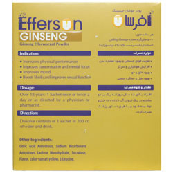 - افرسان جینسینگ حاوی 500 میلی گرم عصاره جینسنگ پاناکس به ازای هر ساشه (استاندارد شده بر حسب 7% - 4% جینسنوزاید)