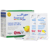 فارماکولوژی: کمبود کلسیم و ویتامین دی در کودکان میتواند باعث عوارضی مانند نارسایی رشد و نرمی استخوان (ریکتز) شود ساشه سوپراکل 200 اختصاصا برای کودکان طراحی شده است. کلسیم یک ماده معدنی مورد نیاز برای رشد و بقا استخوان و دندان، انتقال عصبی، اتساع عروقی، ترشح غدد، انعقاد خون، نفوذ پذیری غشای سلولی و مویرگی، واکنشهای آنزیمی، همچنین در آزاد سازی نوروترنسمیترها و هورمون ها (مانند گلیسرین) نقش موثری دارد. ویتامین دی در فرم فعال جذب کلسیم از روده ها را افزایش می دهد و ترشح و استخراج کلسیم را کاهش داده و سبب حفظ سطح کلسیم خون می شود. ترکیبات: هر ساشه حاوی 1.25 گرم کلسیم کربنات معادل 250 میلی گرم کلسیم و کوله کلسیفرول (ویتامین D3) 200 IU