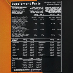پودر پروتئین همراه با شیرین کننده حاوی 33 گرم پروتئین، 140 گرم کربوهیدرات و حاوی 4 گرم بی سی ای ای در هر سروینگ حاوی 20 سروینگ
