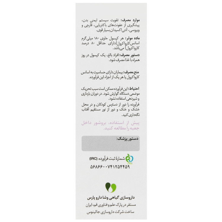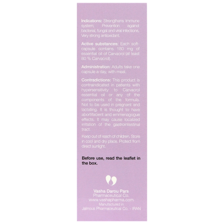 - هر کپسول حاوی 180 میلی گرم اسانس اورگانو (دارای حداقل 80 درصد کارواکرول)