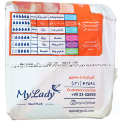 نوار بهداشتی بالدار بزرگ مای لیدی، دارای لایه رویی مشبک به نرمی پنبه برای حس لطافت و خشکی می باشد. این پد نیمه ضخیم بوده و حاوی پودر جاذب با قدرت جذب خیلی خیلی زیاد می باشد. کانال های محافظ جلو و عقب نوار: جلوگیری از نشتی جلو و عقب نوار قسمت میانی ضخیم تر: جهت افزایش جذب در مرکز نوار کانال های جاذب: برای توزیع مایع در سراسر نوار نوارهای آب گریز کناری: برای جلوگیری از نشتی کناره ها ترکیبات: پلی اتیلن، پلی پروپیلن، سلولز، پودر جاذب، چسب حرارتی، نوار سیلیکون