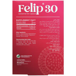 - عوارض جانبی: لیپوزومال بودن آهن موجود در فرمولاسیون فلیپ 30 باعث شده عوارض شایع ناشی از مصرف آهن از جمله عوارض گوارشی نظیر تهوع، اسهال و یبوست به میزان قابل توجهی کاهش یابد. - هشدار و احتیاط مصرف: در صورت مصرف داروهای آنتی اسید، سایر مکمل های حاوی املاح معدنی و یا برخی از آنتی بیوتیک ها، فاصله ی 4-2 ساعت را رعایت کنید. در صورت حساسیت به هر یک از اجزای محصول از ادامه مصرف آن خودداری کنید. خانم های باردار و شیرده در صورت مصرف با پزشک خود مشورت نمایند.