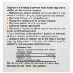 - حاوی 300 میلی گرم منیزیم (سیترات) در هر ساشه