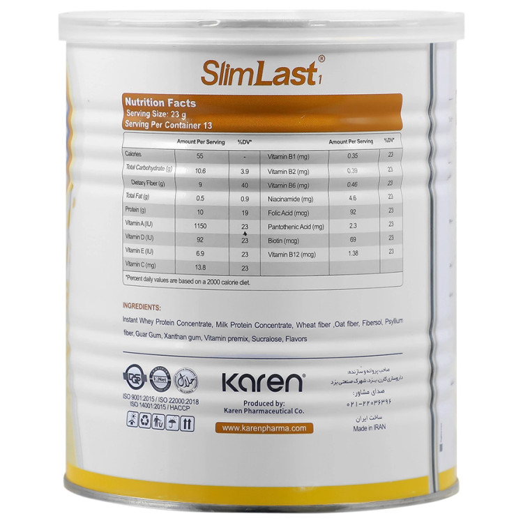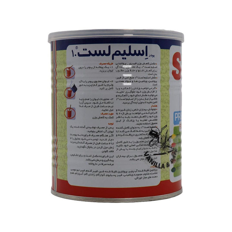 پودر اسلیم لست یک مکمل تغذیه ای غنی از فیبر، پروتئین، ویتامین ها و مواد معدنی بوده که به منظور کاهش اشتها و مدیریت وزن طراحی شده است. این مکمل حاوی پروتئین غلیظ شده آب پنیر، پروتئین غلیظ شده شیر، فیبر گندم، فیبر جو دو سر، نشاسته مقاوم، مجموعه ویتامینی، فیبر پسیلیوم، گوارگام، زانتان گام و آسپارتام بوده که بدون گلوتن طراحی و به منظور کمک به پذیرش بهتر با طعم های متنوعی ارائه شده است.