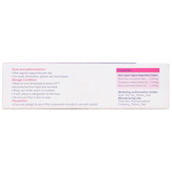 - حاوی ترکیبات طبیعی شامل ویتامین E، ویتامین A و هیالورونیک اسید شامل 21 عدد شیاف واژینال به همراه با اپلیکاتور