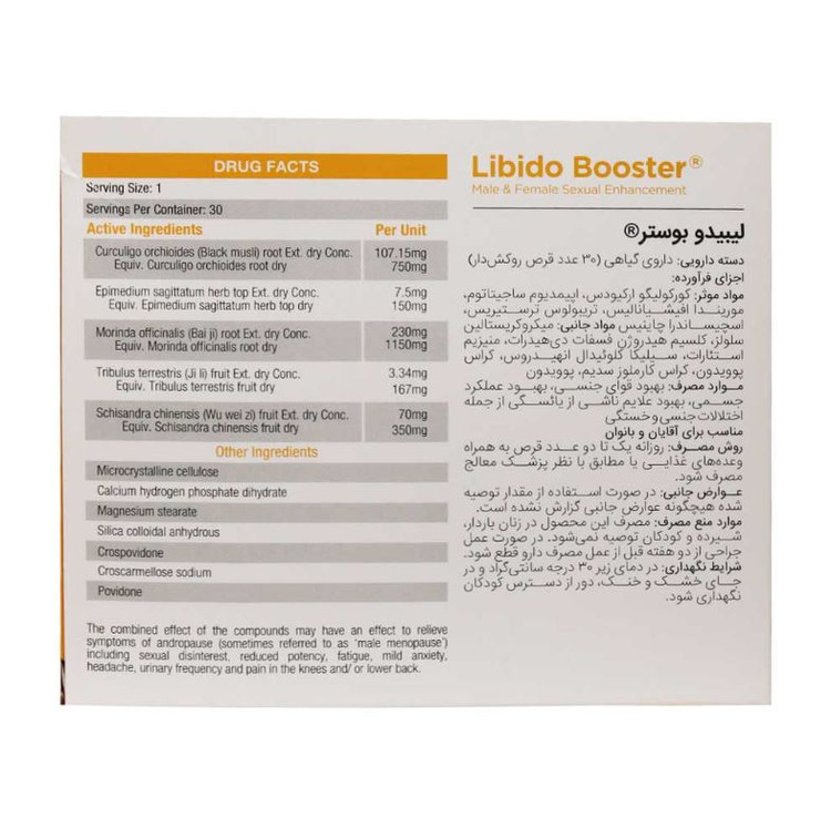 این محصول تحت لیسانس شرکت مک بابن استرالیا به سفارش شرکت دایاژن فارمد، در کارخانه داروسازی فندا در ایران تولید شده است. اختلالات جنسی می تواند ناشی از اختلالات هورمونی، بیماری های زمینه ای، بیماری های مربوط به دستگاه تناسلی و کاهش قدرت بدنی و انرژی باشد. از طرف دیگر بسیار از دلایل کمبود میل جنسی افسردگی و بیماری های روانی می باشد. لیبیدو بوستر با ترکیب چندین گیاه با مکانیسم عمل متفاوت می تواند به افزایش توان و تمایل جنسی هم در بانوان و هم در مردان، بهبود قوای بدن و عملکرد جسمی، و بهبود علائم یائسگی موثر باشد. این فرمولاسیون حاوی گیاهانی است که به طور طبیعی در Traditional Chinease Medicine می تواند مورد استفاده قرار گیرد. مکانیسم اثر هر یک از اجزای موجود در این فرآورده به شرح ذیل است: گیاه اپیمدیوم (Epimedium sagitatum) : ماده موثره این گیاه ایکارین است که با اثر القای سنتز نیتریک اسید خون رسانی به اندام های تناسلی بانوان و مردان را افزایش داده و تحریک جنسی را بالا می برد. از طرف دیگر ایکارین با افزایش بیان ژن مربوط به گیرنده هورمون LH، اثر گذاری این هورمون را افزایش داده و در نهایت باعث افزایش سنتز تستوسترون در آقایان و هورمون های جنسی در بانوان می شود. همچنین با افزایش میزان کلسترول داخل سلولی به عنوان پیش ساز هورمون تستوسترون در افزایش سنتز این هورمون اثر گذار است. ایکارین همچنین با اثر بر نفوذ پذیری سد خونی-بیضوی ( BTB) می تواند اثر محافظتی روی اسپرم ها داشته و آن ها را از آسیب سلولی ناشی از تخریب این سد در امان نگه دارد. خاصیت آنتی اکسیدان ایکارین باعث جذب رادیکال های آزاد و کاهش فاکتور های التهابی شده و هر دو این موارد به سلامت سلول های دستگاه تناسلی کمک می کند. ایکارین موجود در اپی مدیو با اثرگذاری بر میزان ترشح سروتونین و دوپامین باعث هیجان جنسی در افراد شده و در اختلالات جنسی ناشی از افسردگی اثر گذار است در مورد بانوانی که در دوران یائسگی قرار دارند، اپی مدیوم با ترکیبات فیتواستروژنی موجود در خ ود به بهبود علائم یائسگی کمک می کند. همچنین با مکانیسم افزایش سطح سروتونین به بهبهود خلق و خو در این دوره کمک می کند. گیاه موریندا افیسینالیس( Morinda officinalis): ماده موثره این گیاه پلی ساکارید های موجود در آن به نام MOP’s ( Morinda officinalis polysaccharids) است. ماده موثره این گیاه سرشار از آنتی اکسیدان است که با اثر بر شرایط اکسیداتیو استرس می تواند میزان فاکتور های التهابی را کاهش داده و از طرف دیگر فرآیند پیر شدن سلولی را به تعویق بیندازد. همچنین پلی ساکارید های موجد در آن با اثر بر مسیر kiss1/GPR54 میزان ترشح هورمون GnRH را در هیپوتالاموس افزایش داده و از این طریق با تاثیر بر ترشح LH و FSH و تستوسترون اسپرماتوژنز را تحریک می کند و در بانوان میزان هورمون های زنانه را از این طریق افزایش می دهد. گیاه خارخاسک ( Tribulus terrestris): این گیاه سرشار از ساپونین های مختلف و از جمله مهم ترین این ساپونین ها، پروتودیوسین (Protodioscin) است. پروتودیوسین در حقیقت پیش ساز DHEA یا همان دی هیدرواپی آندروسترون دیون است که در نهایت تحت تاثیر واکنش های آنزیمی تبدیل به تستوسترون و یا استرادیول می شود. از طریق دیگر با اثر گذاری بر میزان ترشح نیتریک اکسید، جریان خون را در اندام جنسی افزایش داده و باعث تحریک جنسی می شود. علاوه بر این لازمه حرکت اسپرم ها افزایش میزان آهن داخل سلولی است. بنابراین گیاه خارخاسک با بالا بردن جذب آهن به داخل سلول ها باعث افزایش تحرک اسپرم شذه و در نهایت قدرت باروری را مانند گیاهان قبلی افزایش می دهد. گیاه شیزاندرا (Schisandra chinensis): این گیاه با کاهش شرایط اکسیداتیو استرس باعث افزایش توانایی بدن شده و میزان خستگی جسمانی را کاهش داده و در نهایت توان عضلانی را افزایش می دهد. گیاه کورکولیگو ارکیدوئیس (Curculigo orchioides): این گیاه با دارا بودن ماده موثره ساپونین و استرویید ها مکانیسم عمل مشابه گیاه خارخاسک را داشته و تعداد اسپرم ها را افزایش می دهد. همچنین با اثر بر کانال 