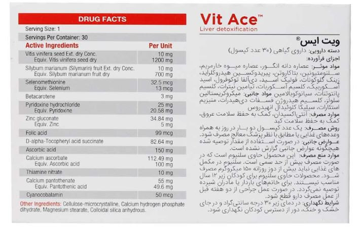 این محصول تحت لیسانس شرکت مک بابن استرالیا به سفارش شرکت دایاژن فارمد، در کارخانه داروسازی فندا در ایران تولید شده است. vitace به عنوان یک بمب آنتی اکسیدانی که فرآورده های مختلف طبیعی و معدنی را داراست، در درمان و بهبود علائم کبد چرب بسیار موثر می باشد. Vitis vinifera: این گیاه با خاصیت آنتی اکسیدانی بالای خود، در پیش گیری از شرایط استرس اکسیداتیو تاثیر به سزایی دارد. گیاه ویتیس وینیفرا یا همان انگور قرمز حاوی درصد بالایی پروآنتوسیانیدین می باشد که در بهبود علائم کبد چرب موثر است. مطالعات نشان می دهد این گیاه به تنهایی و یا به همراه گیاه سیلیبوم ماریانوم سطح آنزیم های کبدی اعم از AST ، ALT و همچنین بیلی روبین را کاهش می دهد و از تخریب سلول های کبدی محافظت می کند. Silybum marianum : این گیاه با آزاد سازی ماده موثره سیلیمارین، در کاهش التهاب کبد ناشی از بیماری های کبدی موثر است. علاوه بر این با خاصیت آنتی اکسیدانی بالای خود، از آسیب های ناشی از رادیکال های آزاد جلوگیری می کند و باعث حفاظت از سلول ها می شود. سیلی مارین با القای تجزیه ملکول های چربی و کاهش سطح کلسترول، تجمع چربی در کبد را مهار می کند. همچنین می تواند سطح آنزیم های کبدی و بیلی روبین را به سطح نرمال باز گرداند. Selenium: این ماده معدنی برای سلامت کبد، لازم و حیاتی است. سلنیوم با خاصیت آنتی اکسیدانی علاوه بر کنترل شرایط استرس اکسیداتیو و محافظت سلولی، در کاهش التهاب کبد نیز موثر است. مطالعات نشان داده است که ریسک ابتلا به بیماری کبد چرب در افراد با سطح سلنیوم پایین، بیش تر است. دریافت روزانه مقدار مناسب از سلنیوم باعث کاهش سطح آنزیم های کبد چرب در افراد مبتلا به بیماری کبد چرب شده و برای سلامت فرد نیز مفید است. Betacarotene: بتاکاروتن ها مشتق از ویتامین آ هستند که در مواد غذایی مختلف یافت می شوند. مطالعات اثبات کرده است که بتاکاروتن ها با خاصیت ضد التهاب و آنتی اکسیدانی خود در درمان کبد چرب موثر می باشند و باعث محافظت از سلول های کبد می شوند. لازم به ذکر اسست که بتاکاروتن به علت ساختار شیمیایی ویژه خود، نسبت به سایر کاروتنوئید ها توان آنتی اکسیدان بالاتری دارد. Zinc : همانند سایر مواد معدنی که نام بردیم، زینک یا همان "روی" هم برای درمان کبد چرب نقش قابل توجهی دارد. نکته ی جالب اینکه زینک در کنار سلنیوم، به عنوان یک ترکیب بسیار قدرتمند عمل کرده و خاصیت ضد التهابی بسیار قوی تری را برای درمان کبد چرب دارد. میزان کلسترول، قند خون و تری گلیسرید ها در بدن افرادی که زینک دریافت کرده اند در مقابل افرادی که رژیم غذایی عادی را پیش گرفته اند به میزان قابل توجهی کاهش داشته. از طرف دیگر میزان کلسترول و تری گلیسیرید در مقابل افرادی که رژیم غذایی عادی دریافت کرده اند به میزان قابل توجهی کاهش یافته است. Multi vitamins: امروزه مطالعات بسیاری در زمینه اثر گذاری ویتامین ها در بهبود علائم کبد چرب انجام شده است. ویتامین ها با خاصیت آنتی اکسیدانی خود می توانند میزان التهاب را کاهش داده، رادیکال های آزاد را جذب کرده و از تخریب سلول های کبدی جلوگیری کنند. همچنین این ویتامین ها با افزایش متابولیسم داخل سلولی میزان سوخت ساز لیپید ها را افزایش میدهند و با شکستن ملکول های چربی مانع از تجمع آن در بافت کبد می شوند.