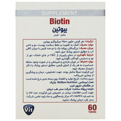بیوتین (ویتامین B7) یک ویتامین محلول در آب است که ویتامین H نیز نامیده می شود و در تولید انرژی نقش مهمی دارد. همچنین در متابولسیم درشت مغذی ها (کربوهیدرات، چربی و پروتئین) موثر می باشد و به حفظ سلامت سیستم عصبی، غشاهای مخاطی، مو و پوست کمک می کند. * این محصول تحت لیسانس شرکت Welfare Nutrition کشور بلژیک، در کارخانه هگمتان داروی غرب تولید شده است و شرکت سمر طب درمان دارنده پروانه ساخت این محصول می باشد.