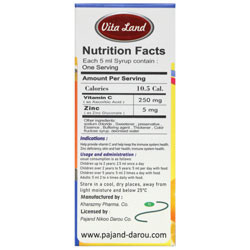 هر 5 میلی لیتر شربت حاوی 250 میلی گرم ویتامین ث و 5 میلی گرم زینک (گلوکونات) حاوی دوز مطلوب زینک و ویتامین C برای کودکان، بر اساس تحقیقات بالینی حاوی طعم دهنده طبیعی پرتقال فاقد شکر