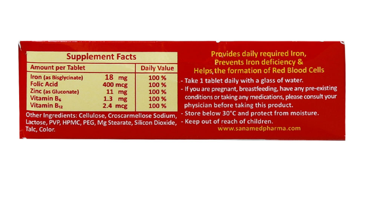 حاوی آهن (بصورت بیس گلیسینات)، فولیک اسید، زینک، ویتامین ب6 و ب12