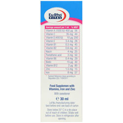 - مکمل قطره خوراکی حاوی 11 نوع ویتامین به علاوه آهن و روی دارای حاوی ویتامین B12 ,B6 ,B2 ,B1 ,E ,D ,C ,A زینک، آهن، نیاسین، بیوتین و پانتوتنیک اسید