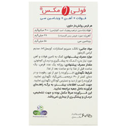 موارد منع مصرف: چنانچه تحت درمان با وارفارین هستید. چنانچه نوزاد مبتلا به نقص مادرزادی قلبی، لوله عصبی یا نخاع دو شاخه ای داشته اید، از طریق مشاوره پزشکی ویژه پیگیری نمایید. - هشدارها و احتیاطات: دلایل کمبود آهن و فولات باید مشخص شود زیرا این کمبود ممکن است به دلیل وجود بیماری های جدی و خطرناک باشد. اگر در صورت مصرف فرآورده دچار حساسیت شدید، بلافاصله مصرف را قطع نموده و با پزشک یا داروساز مشورت نمایید. اگر در طول دوره مصرف این فرآورده مجبور به استفاده از داروهای دیگر شدید با پزشک یا داروساز مشورت کنید. مواردی که قبل از مصرف فولی مکس باید به آن ها توجه شود: - قبل از مصرف این فرآورده با پزشک خود مشورت کنید. - چنانچه حساسیت به هر یک از فرآورده (رجوع شود به قسمت مشخصات فرآورده) یا آهن و فولات دارید. - چنانچه باردار هستید یا قصد بارداری دارید و یا در دوران شیردهی هستید. - چنانچه دچار مشکلات و یا سابقه بیماری های ناشی از فقر آهن هستید. - سایر مشکلات پزشکی مانند هموکروماتوز، هموسیدروز، سایر کم خونی های پورفیری و اهدای خون مکرر. - اثرات جانبی: مصرف این فرآورده حتی اگر طبق دستور و تحت نظر پزشک استفاده گردد ممکن است اثرات جانبی محدودی داشته باشد. در صورت مشاهده هرگونه علائم زیر به پزشک خود مراجعه کنید: جوش، خارش، تورم زبان (صورت و گلو)، سرگیجه، مشکلات تنفسی، کبودی های ناخن و کف دست، رنگ پریدگی، درد یا کرامپ شکمی، تیره شده ادرار.