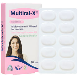 موارد احتیاط و منع مصرف: این فرآورده مکمل بوده و جهت تشخیص، پیشگیری و یا درمان بیماری نمی باشد. در صورتی که شامل هریک از موارد زیر هستید قبل از مصرف فرآورده با پزشک خود مشورت نمایید: بیماران هموفیلیک، نارسایی کلیه و کبد، دیابت، صرع، سرطان و افراد دارای چربی خون، دو هفته قبل از عمل جراحی مصرف این فرآورده را قطع نمایید. بدون جویدن قرص با آب یا نوشیدنی سرد میل شود. به همراه چای یا قهوه مصرف نکنید. عوارض جانبی: هر مکمل به موازات اثرات مطلوب درمانی ممکن است سبب بروز برخی عوارض ناخواسته شود. اگرچه کلیه این عوارض در یک فرد دیده نمی شود ولی در صورت بروز هریک از آن ها با پزشک یا داروساز خود مشورت کنید. این فرآورده ممکن است باعث بروز التهاب مری، خستگی و برافروختگی، سر درد، بی اشتهایی، بی خوابی و مشکلات گوارشی خفیف شود. تداخلات: داروهای فنتوباربیتال، فنیتون و آمیودارون و همچنین داروهای فشار خون بالا مانند کاپتوپریل، فورزماید، هیدروکلر تیازید با ویتامین B6 ویتامین B3 و فولیک اسید موجود در این فرآورده تداخل اثر دارند و مصرف همزمان باعث تشدید اثر این داروها می شود. داروهای ضد انعقاد خون مانند وارفارین با ویتامین A و E تداخل اثر دارند و مصرف همزمان خطر خونریزی را افزایش می دهد. استفاده از آنتی اکسیدان ها مانند ویتامین ث در طول شیمی درمانی می تواند فعالیت داروهای شیمی درمانی را کاهش دهد. داروی کلرامفنیکل با این فرآورده به دلیل حضور ویتامین B12 تداخل اثر دارد. داروهای پنیسیلامین، سفالکسین، کینولون، تتراسایکلین ها مانند داکسی سایکلین و همچنین داروهای کینولون مانند سیپروفلوکساسین با این فرآورده به دلیل حضور زینک، منیزیم و منگنز تداخل اثر دارند. فاصله زمانی این داروها با فرآورده حداقل 3 ساعت باشد، مصرف همزمان داروهای حاوی آلومینیوم با ویتامین D ممکن است منجر به زیادی آلومینیوم خون، به ویژه در بیماران مبتلا به نارسایی مزمن کلیوی گردد. مصرف همزمان ویتامین D با داروهای دیلتیازم، دیگوکسین، وراپامیل و آتورواستاتین، فرآورده های حاوی کلسیم یا مدرهای تیازیدی تداخل دارد. مصرف منگنز همراه با هالوپریدول، سایر داروهای ضد روان پریشی ممکن است خطر سمیت منگنز را در برخی بیماران افزایش دهد. داروهای لووتیروکسین، متیل دوپا و لوودوپا با این فرآورده به دلیل حضور آهن تداخل اثر دارد. داروهای ضد دیابت مانند انسولین، رزیگلیتازون با این فرآورده به دلیل حضور زینک و ویتامین B3 تداخل اثر دارند. این فرآورده را با داروهای ضد آکنه (رتینوئیدها) مصرف نکنید. روغن گل مغربی در موارد صرع و جنون منع مصرف دارد. به علت اینکه این فرآورده بر مراحل انعقاد خون تاثیر می گذارد نبایستی همراه با داروهای ضدانعقاد مصرف گردد. مصرف در بارداری و شیردهی: این فرآورده در دوران بارداری و شیردهی با مشورت پزشک مصرف شود.