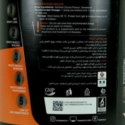 منبع متراکم از پروتئین دارای مقادیر زیادی از اسیدهای آمینه ضروری سرشار از BCAAs مواد جانبی: زانتان، کلرید سدیم و طعم دهنده کم چرب و کم لاکتوز