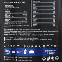 دارای درصد پروتئین و گلوتامین بالا سرشار از BCAAs (آمینو اسید شاخه دار) آهسته رهش مواد جانبی: پودر کاکائو، طعم دهنده، سوکرالوز، کلرید سدیم مناسب مصرف شب