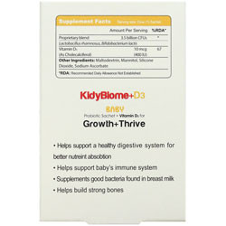 ساشه پروبیوتیک + ویتامین D3 مخصوص کودکان (12 تا 24 ماهگی) حاوی 15 ساشه 2 گرمی حاوی: - باکتری های لاکتوباسیلوس رامنوسوس و بیفیدوباکتریوم لاکتیس در مجموع به میزان 3.5 میلیارد - ویتامین D3 به میزان 10 میکروگرم معادل 400 IU فاقد گلوتن، سویا، GMO، گندم، آجیل درختی، بادام زمینی و مواد نگهدارنده