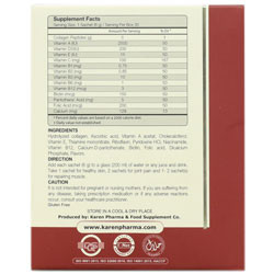 ترکیبات: کلاژن هیدرولیز شده، اسید آسکوربیک، ویتامین A استات، کوله کلسیفرول، ویتامین E، تیامین مونونیترات، ریبوفلاوین، پیریدوکسین هیدروکلرید، نیاسین آمید، ویتامین B12، اسید فولیک، کلسیم د پانتوتنات، بیوتین، دی کلسیم فسفات، طعم دهنده های مجاز خوراکی.