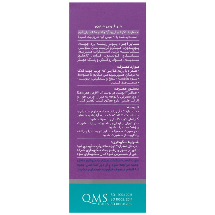 - موارد منع مصرف: در موارد تنگی یا انسداد مجاری صفراوی، حساسیت شناخته شده به آرتیشو یا سایر گیاهان تیره کاسنی مصرف نشود.