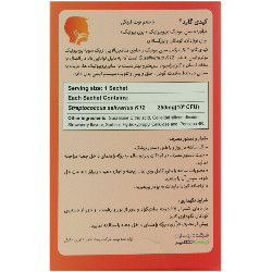 - عوارض جانبی: سویه پروبیوتیکی مورد استفاده در این محصول ایمن است. بسیاری از پروبیوتیک ها به عنوان عوامل GRAS (Generally Recognized Safe) توسط سازمان غذا و داروی آمریکا (FDA) به ثبت رسیدهاند و بقیه توسط اروپا و ژاپن تایید شده است. پروبیوتیک ها به خوبی تحمل می شوند، ولی ممکن است در بعضی از بیماران ایجاد نفخ کنند که معمولا با ادامه مصرف برطرف می شود. در صورت ادامه یا تشدید این عارضه، می بایست به پزشک یا داروساز اطلاع داده شود.