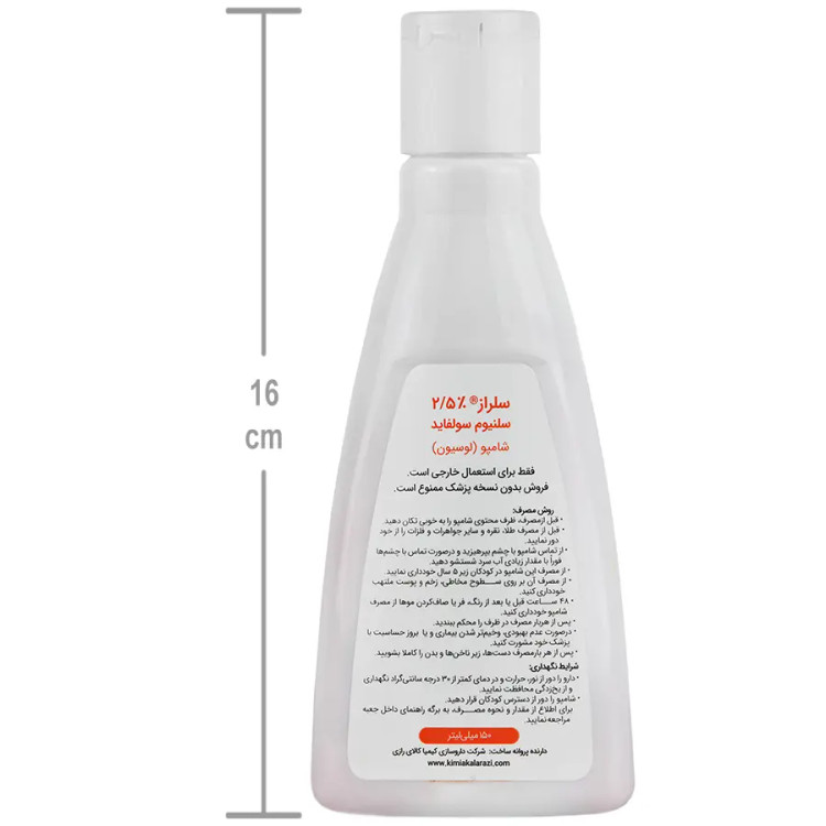 پیش از مصرف: این شامپو برای وضعیت فعلی شما تجویز شده است لذا از مصرف آن در موارد مشابه و یا توصیه آن به دیگران خودداری نمایید. شامپو سلنیوم سولفاید فقط برای استعمال خارجی می باشد. در صورت حساسیت به سلنیوم سولفاید و هر یک از اجزای تشکیل دهنده آن از مصرف شامپو خودداری نمایید. با توجه به افزایش جذب، از مصرف آن بر روی سطوح مخاطی، زخم باز و پوست ملتهب خودداری کنید. قبل از مصرف طلا، نقره و سایر جواهرات و فلزات را از خود دور نماید چرا که ممکن است سبب ایجاد تغییر رنگ در آن ها گردد. در صورت استفاده از هر نوع شامپوی دیگر با داروساز یا پزشک خود مشورت نمایید. در صورت بارداری و شیردهی به پزشک یا داروساز خود اطلاع دهید. احتیاط ها و هشدار ها: مصرف شامپو در کودکان زیر 5 سال توصیه نمی شود. از تماس شامپو با چشمها بپرهیزید و در صورت تماس با چشم فورا با آب سرد فراوان شستشو داده شود. در صورت بروز حساسیت، از مصرف شامپو خودداری نموده و با پزشک مشورت نمایید. در صورت عدم بهبودی وخیم تر شدن بیماری با پزشک خود مشورت کنید. 48 ساعت قبل یا بعد از رنگ، فر یا صاف کردن موها از مصرف شامپو خودداری کنید. شامپو را بیش از حد توصیه شده در تماس با مو یا پوست قرار ندهید. پس از هربار مصرف دست ها، زیرا ناخن ها و بدن کاملا شستشو داده شود. بارداری و شیردهی: بارداری: این شامپو از نظر گروه بارداری در رده C می باشد، لذا مصرف این دارو در دوران بارداری توصیه نمی شود. شیردهی: ترشح این دارو در شیر ناشناخته است لذا مصرف آن در دوران شیردهی با احتیاط صورت پذیرد. عوارض جانبی: هر دارو به موازات اثرات درمانی خود، ممکن است موجب بروز عوارض جانبی گردد، اگرچه این تاثیرات در همه افراد دیده نمی شود.این عوارض شامل موارد زیر می باشد: - بثورات پوستی یا کهیر، تحریک و حساسیت پوست یا پوست سر، افزایش ریزش طبیعی موی سر، چربی و خشکی مو و پوست سر - تغییر رنگ موها که ممکن است با شستشوی کامل مو پس از درمان از آن جلوگیری شود.