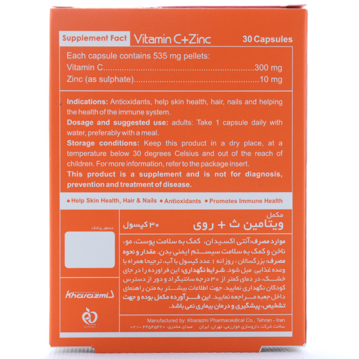 هر کپسول حاوی 300 میلی گرم ویتامین سی و 10 میلی گرم روی (به صورت سولفات)