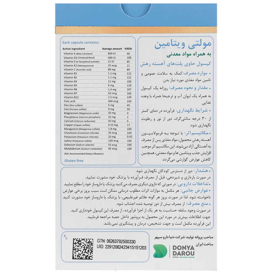 مکانیسم اثر:با توجه به فرمولاسیون آهسته رهش محصول، مواد مغذی پس از مصرف به آهستگی آزاد می شوند. این مکانیسم اثر موجب افزایش جذب ویتامین ها و مواد معدنی و همچنین کاهش عوارض گوارشی می گردد.فواید هر یک از ترکیبات:ویتامین های گروه ب: افزایش رشد و تقسیم سلولی به ویژه در مورد گلبول های قرمز خونی، افزایش و تقویت میزان متابولیسم و سوخت و ساز بدن، افزایش قدرت سیستم ایمنی و عملکرد مناسب سیستم عصبی، تقویت و افزایش سلامت پوست و قدرت عضلانیویتامین آ: تقویت بینایی به ویژه در نور کمویتامین سی و ای: جلوگیری از آسیب رادیکال های آزاد در بدنویتامین د و کلسیم: رشد و تقویت استخوان و افزایش استحکام ناخن و دندانمنیزیم: بهبود انقباض عضلات، عملکرد صحیح سیستم عصبی، کنترل قند خون، کنترل فشار خون و تولید انرژی سلولیپتاسیم: تنظیم تعادل اسید-باز در بدنزینک و ویتامین د: افزایش سطح ایمنی بدن و افزایش استحکام استخوان، مو و ناخنویتامین کا: حفظ سلامت استخوان و قلب
