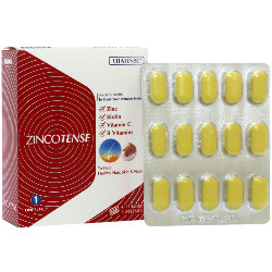 اجزای فرآورده و مکانیسم عمل:زینکوتنس فرموله شده از ترکیبات ،زینک ویتامین های گروه ب و ویتامین سی می باشد. این مجموعه ترکیبات با تقویت اثرات یکدیگر در بدن سبب کمک به حفظ سلامت پوست مو ناخن ها و تقویت سیستم ایمنی می شوند.زینک: یک عنصر اساسی برای بدن به شمار میرود دریافت روزانه آن از مواد غذایی با در نظر گرفتن میزان مورد نیاز بدن بسیار ناچیز است اما وجود این عنصر برای سلامتی و رشد عمومی بسیار حیاتی می باشد. زینک در جلوگیری از ریزش مو کمک به تقویت ناخنها و حفظ سلامت پوست از طریق تولید سلول های جدید نقشی اساسی بر عهده دارد. این ماده دارای خواص ضد التهایی است و می تواند به رفع قرمزی و سوزش ناشی از آکنه و همچنین بهبود ظاهر زخم های آکنه کمک کند زینک همچنین از ایجاد لکه های سفید روی ناخن ها جلوگیری می کند.ویتامین B2: به جذب آهن مورد نیاز برای داشتن ناخن های سالم و قوی کمک می کند و آهن کافی باعث افزایش رشد ناخن ها می شود.ویتامین B3: رطوبت پوست را افزایش داده و چین و چروک و خشکی آن را کاهش می دهد.ویتامین B5: برای سلامتی و رشد مو بسیار حیاتی است. این ویتامین جریان مواد مغذی را در ریشه مو بهبود می بخشد و در نتیجه از ریزش مو می کاهد.ویتامین B6: در تولید کراتین در بدن نقش مهمی ایفا میکند کراتین در کاهش ریزش مو و استحکام آن نقش اساسی دارد. همچنین باعث تقویت ناخن های ضعیف و شکننده می شود.ویتامین B12: تولید رنگدانه های پوستی را کنترل و لکه های پوستی را از بین می برد. پوست را شفاف و صاف کرده و اثرات پیری آن را بطور چشمگیری کاهش می دهد.ویتامین C: به عنوان یک آنتی اکسیدان سیستم ایمنی را در دفاع از بدن تقویت می کند و به از بین بردن سیاهی و افتادگی پوست و همچنین کاهش چین و چروک کمک می کند.