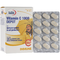 ویتامین C 1000 دپو یوروویتال تامین کننده ویتامین C به میزان 1000 میلی گرم به علاوه 25 میلی گرم سیتروس بیوفلاونوئید در هر قرص می باشد.ویتامین C در عملکرد طبیعی سیستم ایمنی موثر است. به عنوان عامل از بین برنده رادیکال های آزاد، ویتامین C در محافظت از سلول ها در برابر استرس اکسیداتیو نقش دارد. همچنین این ویتامین نقش مهمی را در فعال سازی ویتامین E احیا شده ایفا می نماید که می تواند در کاهش استرس اکسیداتیو موثر باشد.این محصول تحت امتیاز و لیسانس شرکت Euro OTC Pharma GmbH کشور آلمان، دارنده پروانه ساخت از شرکت حکیمان طب کار، در پرارین پارس در ایران تولید شده است.