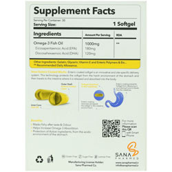 - هر کپسول ژلاتینی نرم حاوی 1000 میلی گرم روغن ماهی انتریک کوتد (دارای پوشش روده ای)، دارای 180 میلی گرم EPA و 120 میلی گرم DHA