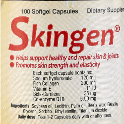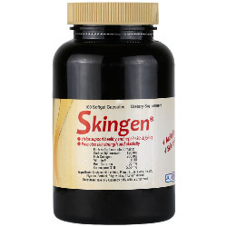 هیالورونیک اسید: یک ماده طبیعی در پوست است که در جذب و حفظ رطوبت پوست موثر است. با بالا رفتن سن، پوست توانایی حفظ رطوبت را از دست میدهد و به همین دلیل چین و چروک بیشتر میشود. سدیم هیالورونات موجود در اسکین ژن برای لایههای زیرین پوست رطوبت ایجاد میکند و با این کار طراوت و جوانی پوست را چندین برابر می کند، همچنین لایههای بیرونی پوست را احیا کرده و خطوطچین و چروک ها را بهبود می بخشد.کلاژن: ساختار پروتئینی است که در پوست، مفاصل استخوان و ماهیچهها یافت میشود. کلاژن ساختار پوست، مفاصل و ماهیچه ها را محکم می کند. با افزایش سن، درصدی از کلاژن از دست می رود. وقتی کلاژن کم میشود خاصیت کشسانی پوست کاهش مییابد و پوست به تدریج شل و در نتیجه چروک ها نمایان میشود. به دلیل نقشی که این ترکیب پروتئینی در زیبایی و جوانی دارد، کمبود آن باید تامین گردد. کلاژن موجود در اسکین ژن قادر به جبران کاهش کلاژن در بدن می باشد و پوست را شاداب و جوان می کند.کوآنزیم کیو10: یک آنتی اکسیدان محلول در چربی است که از پراکسیداسیون لیپیدهای غشایی جلوگیری کرده، به تثبیت غشای سلولی کمک میکند و سبب حفظ استحکام و عملکرد سلول و تقویت سیستم ایمنی بدن میشود. کوآنزیم کیو10 موجود در اسکین ژن برای سلامت پوست مهم می باشد و پوست را در برابر نور خورشید و سایر تابش های مضر محافظت میکند. ویتامین E: یکی از مهم ترین ویتامینها در سلامت پوست و مو می باشد. ویتامین E دارای خواص ضد التهابی است و در حفاظت از سیستم ایمنی بدن، بهبود عملکرد سلولها و سلامت پوست موثر است. ویتامین E یک نوع آنتی اکسیدان است وتاثیر زیادی در مبارزه با رادیکالهای آزاد دراد که بر اثر سوخت و ساز غذا و سموم ایجاد می شود. همچنین در کاهش آسیب ناشی از قرار گرفتن در معرض اشعه فرابنفش در پوست هم بسیار تاثیر گذار است. سطح ویتامین E با بالا رفتن سن کاهش پیدا می کند.بتاکاروتن: بتاکاروتن یک کاروتنوئید و پیش ساز ویتامین A است. بتاکاروتن یکی از مواد آنتی اکسیدان قوی می باشد که از تولید رادیکال آزاد اکسیژن در بدن جلوگیری می کند و برای تقویت سیستم ایمنی بدن، پیشگیری از انواع سرطان، بهبود علائم و کاهش حساسیت به نور و قدرت بینایی موثر می باشد.