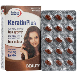 کراتین پلاس یوروویتال ترکیبی متعادل از ویتامین ها به علاوه مس می باشد که در حفظ سلامت و زیبایی مو موثر است. همچنین این فراورده حاوی 150 میلی گرم کراتین در دوز مصرفی روزانه می باشد.روی و بیوتین در حفظ موی سالم و طبیعی موثر است. مس در رنگدانه سازی طبیعی مو نقش دارد. به علاوه مس و روی در حفاظت از سلول ها در برابر استرس اکسیداتیو و فولیک اسید در سنتز طبیعی اسیدهای آمینه موثر می باشند. کراتین یک واژه کلی برای پروتئین های فیبری و ساختار کلیدی در ساختار مو و لایه خارجی ناخن می باشد.این محصول تحت امتیاز و لیسانس Euro OTC Pharma GmbH کشور آلمان در داروسازی دانا در ایران تولید شده و شرکت حکیمان طب کار دارنده پروانه ساخت آن می باشد.
