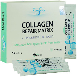 مکانیسم اثر:پپتیدهای کلاژن با دسترسی زیستی بالا (جذب بالا): برای داشتن پوستی صاف و سفتاسید هیالورونیک: برای آبرسانی و جوانسازی پوستویتامین سی: برای تقویت کلاژن سازیروی و سلنیوم: برای داشتن موهایی پرپشت و ناخن هایی محکمویتامین ب2: برای داشتن پوستی زیباکلاژن ریپر ماتریکس محصول شرکت نوریا درمان پاسارگاد، تحت لیسانس شرکت mec pharma جمهوری چک، در شرکت داروسازی میم دارو تولید شده است.