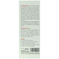 سرم سی-برایت (حاوی 25 درصد ویتامین سی) محصولی فاقد چربی و غنی از ترکیبات آنتی اکسیدانی قوی با پایداری بالا برای محافظت از پوست در برابر اشعههای UVA ،UVB ،IR و آلاینده هایی است که باعث پیری زودرس پوست می شوند.