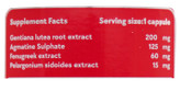 - عصاره ریشه گیاه جنتیانا: منشا مواد موثره این گیاه مواد تلخ موجود در گیاه است. این مواد سبب تحریک رفلاکس گیرندههای طعم شده و منجر به افزایش ترشح بزاق و مواد گوارشی میشوند. در نتیجه این ترکیب نه تنها تلخ نیست، بلکه یک ماده مقوی و ترمیم کننده است. علاوه بر آن محرک کیسه صفرا است و موجب مهار رشد قارچها میشود. این دارو به عنوان یک ماده مقوی استفاده شده و سبب تحریک ترشح صفرا و برطرف نمودن بی اشتهایی، احساس سیری و نفخ شکم میشود.