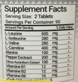 لوسین، ایزولوسین، والین، ال کارنیتین، آلانین، عصاره فلفل، عصاره نارنج، ویتامین ب۱، ویتامین ب۲، ویتامین ب۶، اسکوربیک اسید، پی وی پی، میکرو کریستالین سلولز، منیزیم استئارات، سیتریک اسید.