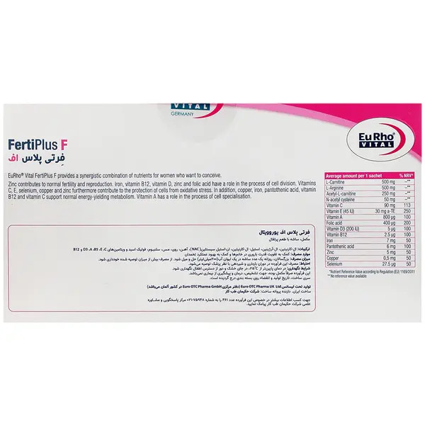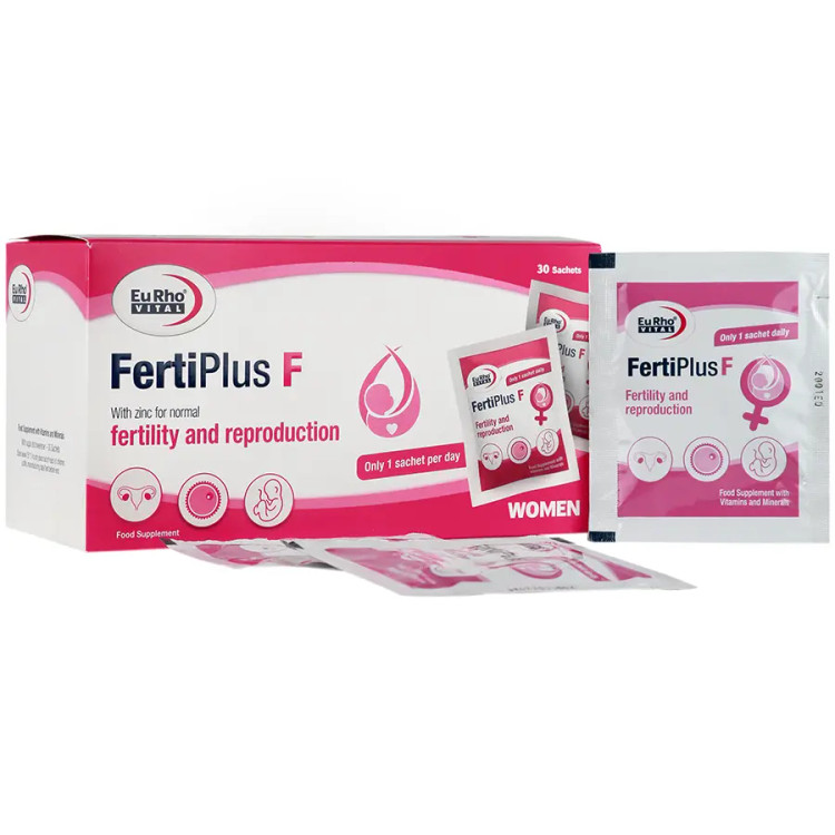 ساشه فرتی پلاس اف یوروویتال حاوی ال-کارنیتین، ال-آرژینین، استیل-ال-کارنیتین و ان-استیل-سیستئین (NAC) بههمراه ویتامینها و مواد معدنی است و یک مکمل موثر در کمک به درمان ناباروری زنان میباشد.