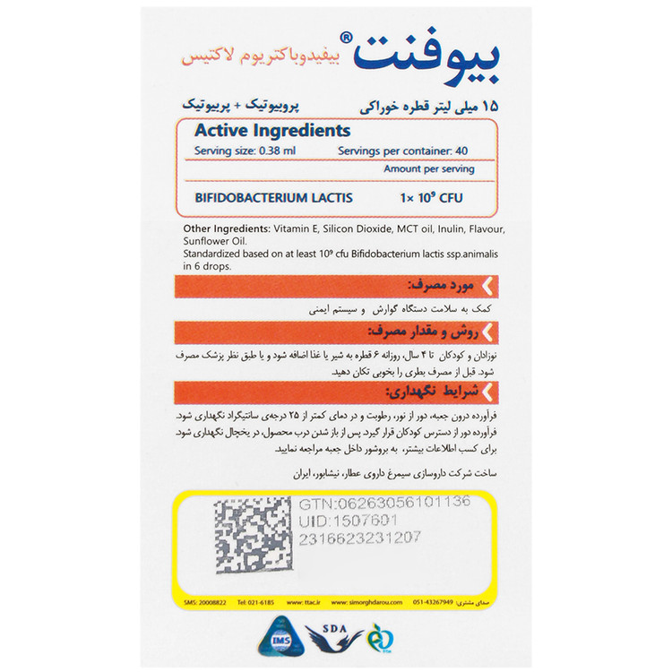 - قطره بیوفنت، مکمل تغذیهی یببببای حاوی پربیوتیک و پروبیوتیک بیفیدوباکتریوم لاکتیس انیمالیس