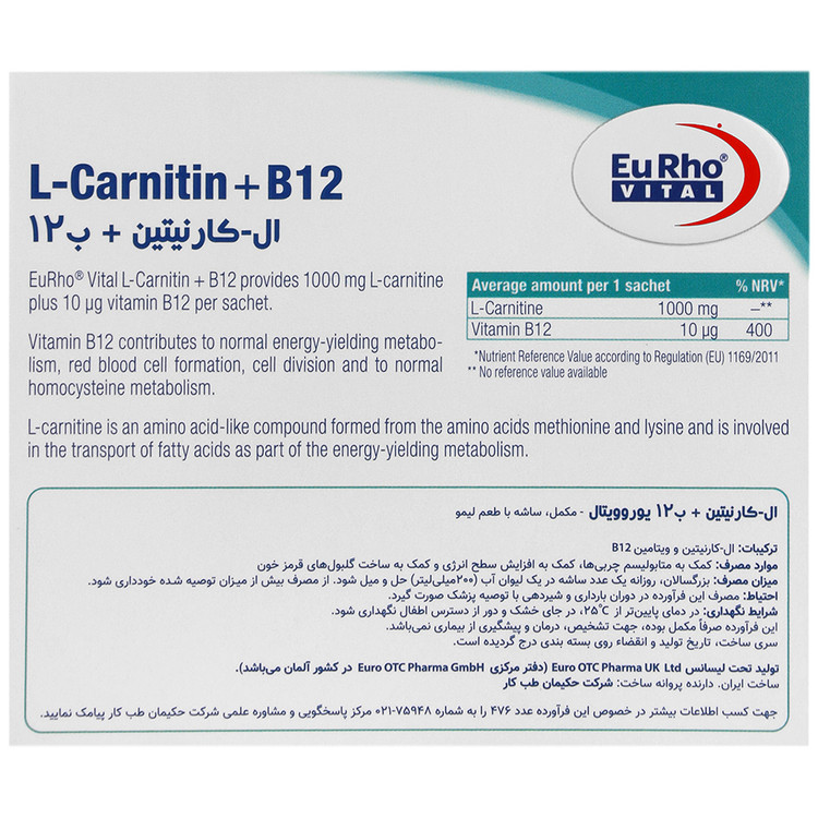 ویتامین B12 نیز از ویتامینهای محلول در آب است که نقش مهمی در تولید گلبولهای قرمز و تنظیم سطح هموسیستئین خون ایفا میکند. این ویتامین برای حفظ سلامت و عملکرد مناسب سیستم عصبی ضروری است و کمبود آن عوارضی همچون خستگی، کمخونی مگالوبلاستیک و اختلال عملکرد سیستم عصبی را بهدنبال دارد. ساشه خوراکی ال-کارنیتین + ب12 یوروویتال حاوی 1000 میلیگرم ال-کارنیتین و 10 میکروگرم ویتامین B12 میباشد.ال-کارنیتین: