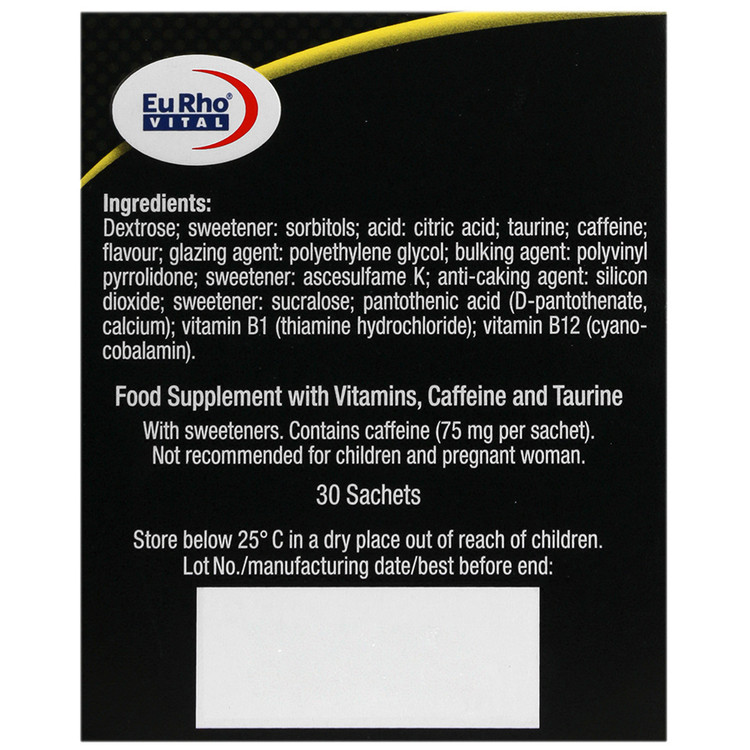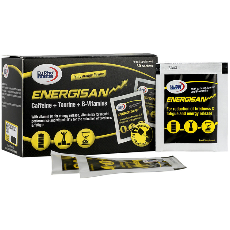 ساشه خوراکی انرژیسان یوروویتال حاوی ویتامینهای B1 ،B5 و B12، کافئین، آمینو اسید تائورین و دکستروز است که باعث افزایش سطح انرژی و بهبود عملکرد ورزشی میشود. همچنین مصرف این مکمل خستگی ذهنی را کاهش میدهد و باعث افزایش قدرت تمرکز در همه افرادی میشود که کارهای فکری و ذهنی انجام میدهند.