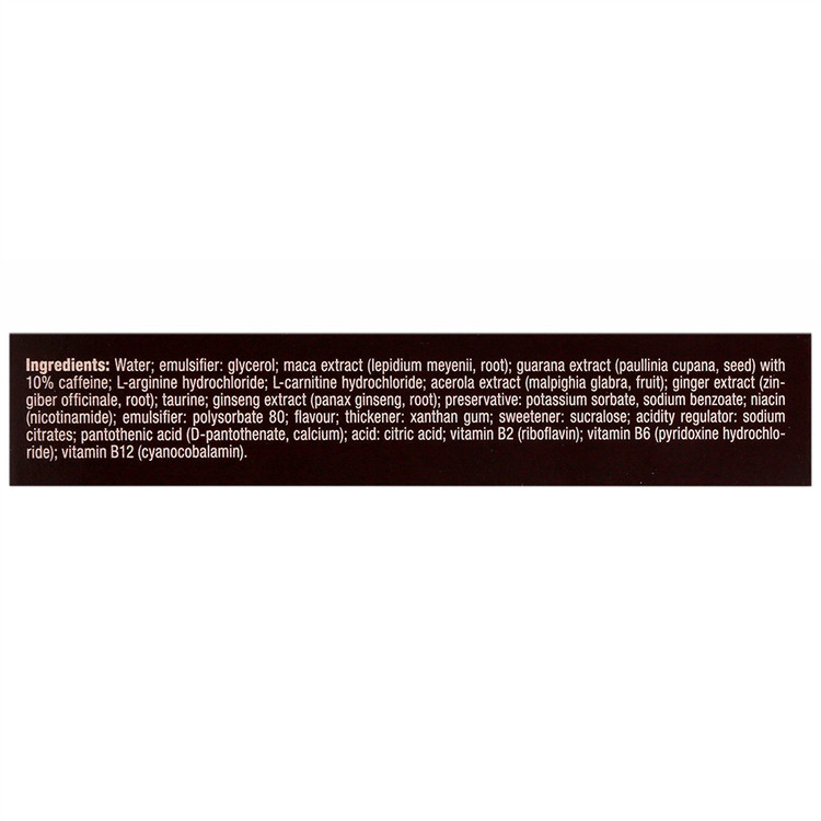 - ترکیبات: ال-آرژینین، ال-کارنیتین، تائورین، ویتامین های B2 ،B3 ،B5 ،B6 ،B12 عصاره ماکا، عصاره گوارانا، عصاره زنجبیل، عصاره جینسینگ و عصاره آسرولا (حاوی 40 میلی گرم ویتامین C)