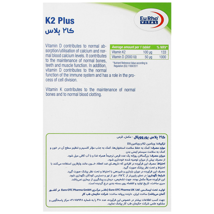 - کا 2 پلاس یوروویتال، حاوی 100 میکروگرم ویتامین K2 و 2000 واحد ویتامین D3 به ازای هر قرص