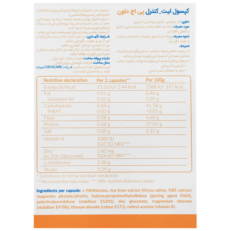 - لیت کنترل پی اچ داون، حاوی ال-متیونین، فیتین، ویتامین A و زینک به فرم زینک گلوکونات